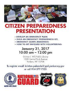 YONKERS, NY January 3, 2017 — The Yonkers Police Department Office of Emergency Management (OEM) will be partnering with the National Guard to give a free citizen preparedness presentation on January 31, 2017 at 10:00 a.m. at the Grinton I. Will Library, located at 1500 Central Park Avenue. Note free adjacent on-site parking.